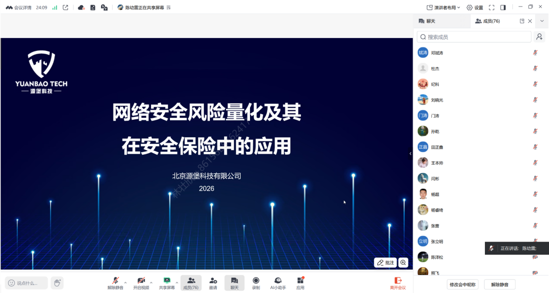 本次培训特邀北京网络空间安全协会副理事长单位北京源堡科技有限公司的技术总监、博士、正高级工程师陈幼雷进行系统授课。程内容围绕“理论奠基—模型构建—场景应用—保险融合”的递进框架展开,系统讲解了网络安全风险识别、量化评估模型、行业场景实践以及风险量化数据在网络安全保险定价、承保、理赔等关键环节的应用,为学员构建了完整的知识体系与实践路径。培训注重理论与实践相结合,对于推动网络安全风险管理科学化、精细化,促进网络安全保险产业健康发展具有积极意义。
