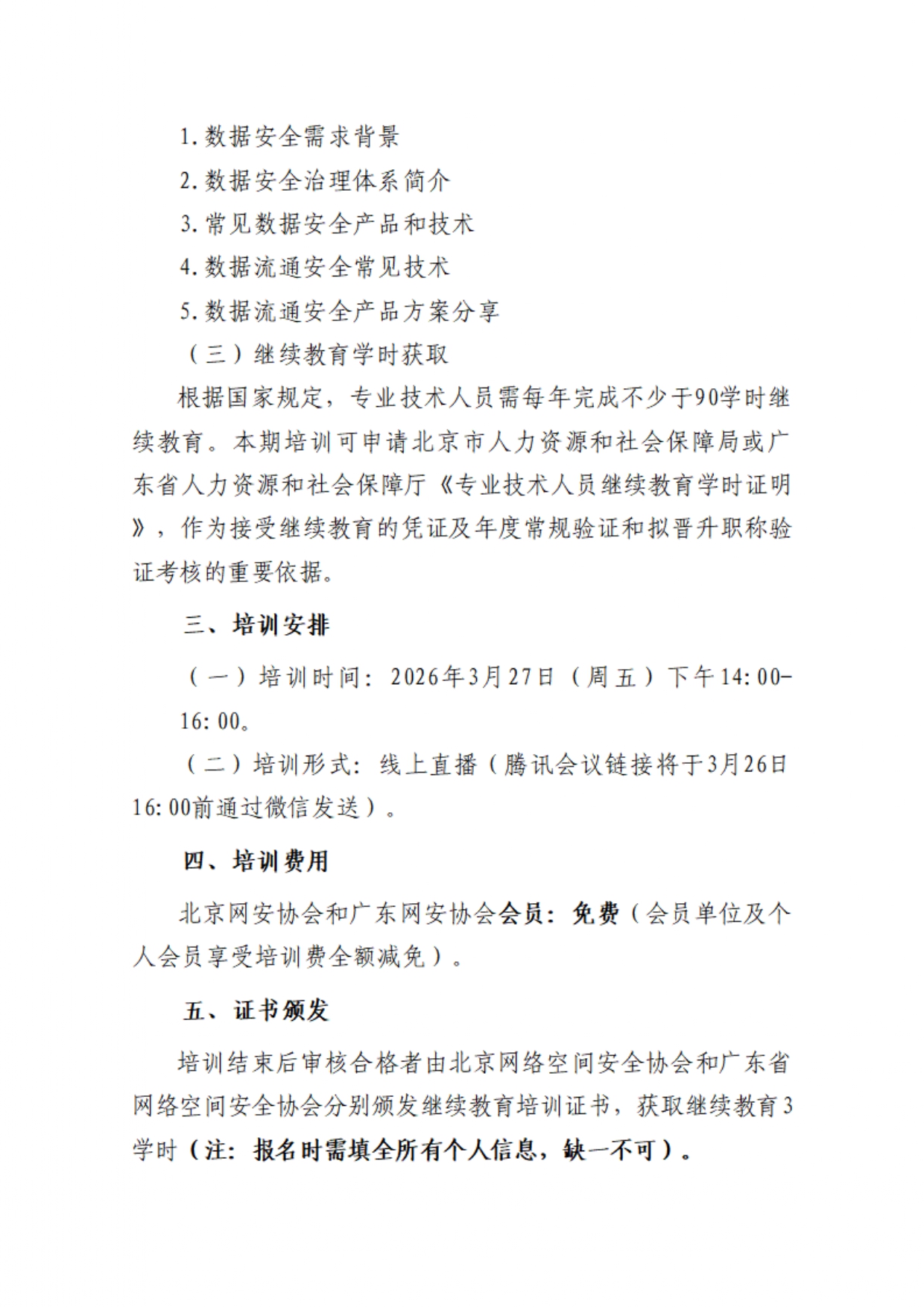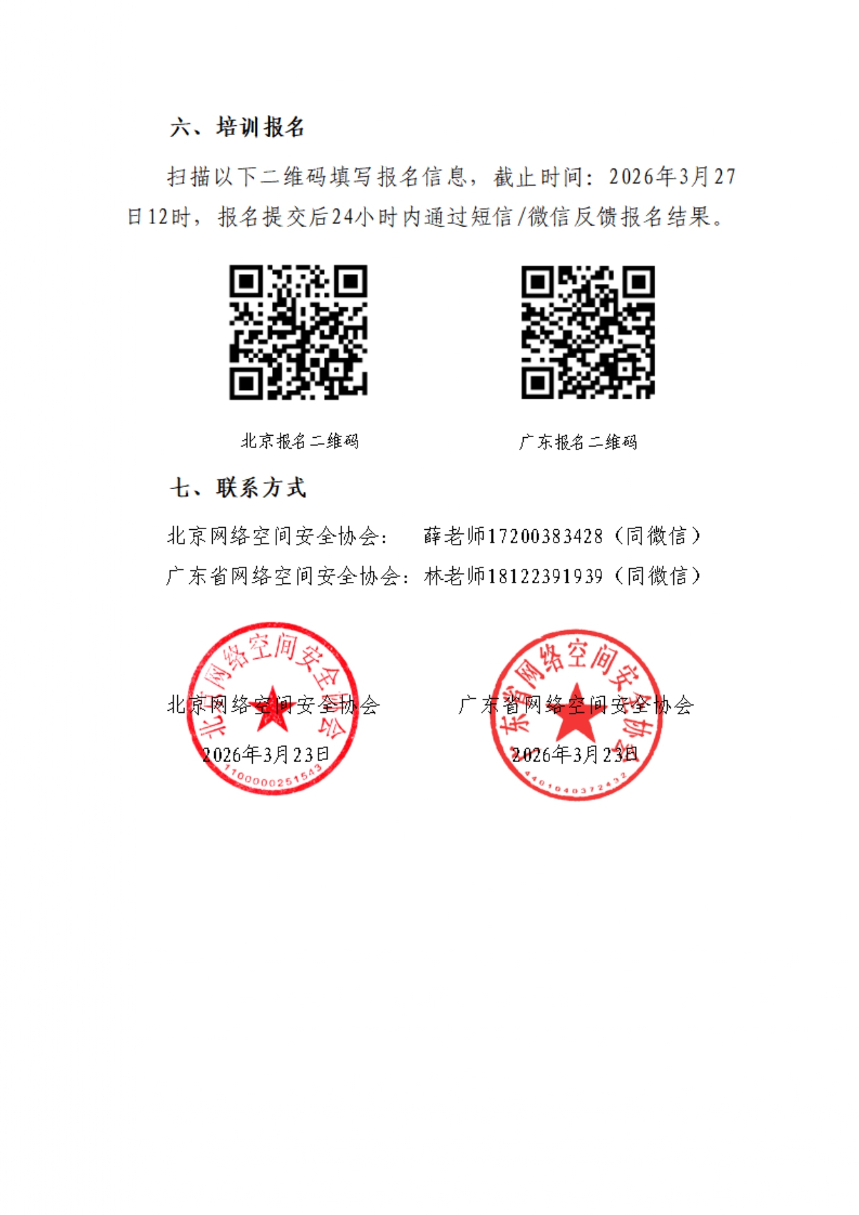 继续教育学时获取:培训结束后审核合格者由北京网络空间安全协会和广东省网络空间安全协会分别颁发继续教育培训证书,获取继续教育3学时。(注:有需要继续教育学时的学员请扫描填写二维码的所有选项,缺一不可,并线上听课前进行实名签到。)