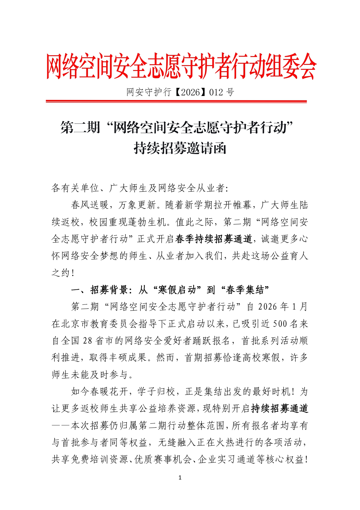 第二期 “网络空间安全志愿守护者行动” 春季持续招募如下: